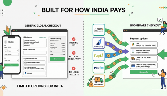 PrestaShop was built for European and North American payment ecosystems. Indian payment integration is an afterthought, usually handled through third-party modules that cost between Rs 3,000 and Rs 15,000 each. Boomimart, by contrast, was architected around India’s payment infrastructure from day one. UPI, COD management, and prepaid order incentives are part of the standard package.