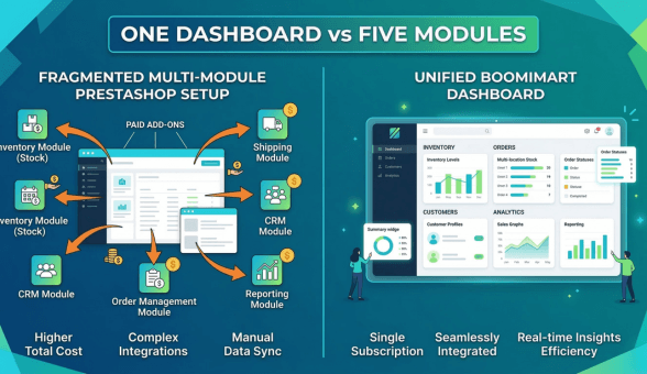 PrestaShop has basic inventory tracking built in, but serious stock management requires paid extensions. Boomimart integrates order management, inventory tracking, and vendor management in a single dashboard. This directly connects to the insight covered in inventory management best practices for online stores, where real-time stock sync prevents overselling.